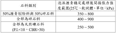 一般而言,若額外添加的水泥量在重量比的1%至2%之間時,不同材料組合的最佳泡沫瀝青含量範圍如表1所示。